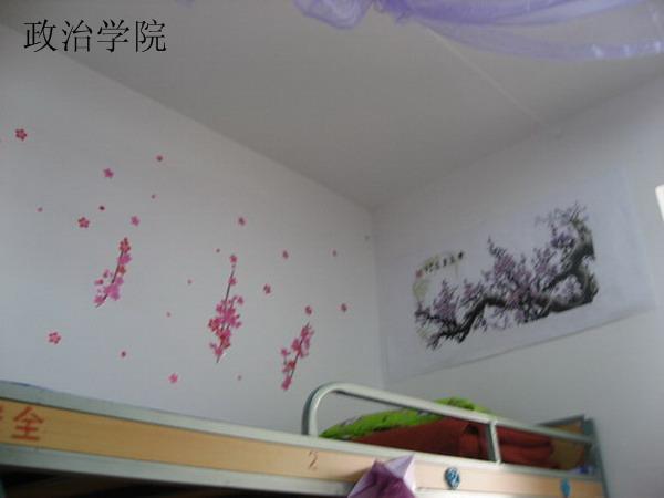 以“彼岸花开”为主题的寝室,精致优雅,细节之处尽展精致,取得了本次的比赛的二等奖。墙顶的淡紫纱幔、墙上的两幅十字绣,展现了寝室主人的心灵手巧。窗上墙上缤纷多样的花朵、手折的百合花、墙角处的草坪图样,尽展细致心思。