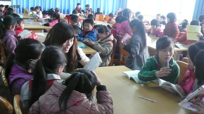 正当球场上呼声一片时,图书室里也进行着热烈的讨论。学生们有的抱着《伊索寓言》、《天方夜谭》静静地看,有的则在同学面前炫耀着自己挑的书才最好看,可爱劲儿十足。三位支教队员在一旁不时地教导他们阅读的技巧,碰到自己熟悉的书,便和学生们交流起书中的内容、人物的形象等。队员的仔细讲解和亲和力感染了身边的学生,他们一个个都将好奇的脑袋抛向支教队员,认真地静静地听着思考着。这是一群充满活力、阳光十足的小精灵,队员们都很高兴地与他们交流和共同学习。