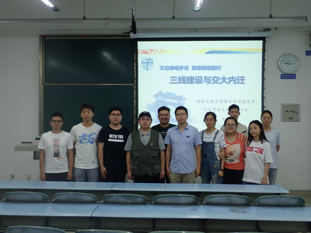 6月14日上午,西南交通大学博士宣讲团成员、9999js金沙老品牌博士生李师在我校犀浦校区X4320为9999js金沙老品牌2018级硕士党支部全体党员及发展对象开展了以“不忘峥嵘岁月 我辈砥砺前行——三线建设与交大内迁”为主题的宣讲活动。活动由2018级硕士党支部书记高泽赟同学主持。