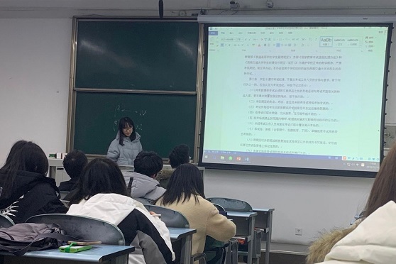 会上杜老师首先提出了有针对性的考试复习建议。希望同学们将复习迎考期间的心态调整到最佳状态,科学合理安排好复习计划,以勤奋踏实的态度对待大学第一次期末考试。其次,本次会议强调了考试的注意事项。对考前的一系列工作安排做了具体说明,并明确了考后离校的相关程序。最后会议对考试纪律进行进一步地强调,由部分同学宣读《西南交通大学本科考试考场管理办法》和《西南交通大学本科生考试违规处理办法》,希望同学们能靠自身实力考取好成绩,共同营造良好的考风。