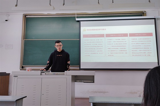 团支书吴昊同学首先总体介绍了党史发展脉络及学习意义,随后分别详细介绍了新民主主义时期、社会主义革命建设时期以及改革开放和社会主义建设新时期中国共产党做出的卓越贡献,让同学们牢固树立“学党史、知党情、跟党走”的意识。