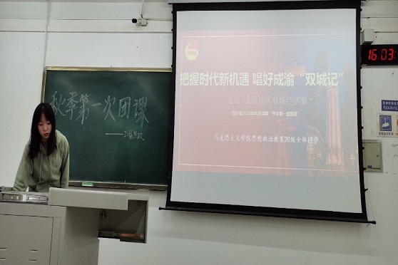 2020年10月12日下午16时,西南交通大学2020级9999js金沙老品牌思想政治与教育专业的全体同学召开了以“把握时代新机遇,唱好成渝‘双城记’——走近‘成渝地区双城经济圈’”为主题的团课,本次团课由思政2020-01支部团支书徐景行和思政2020-02支部李聪昊主持。