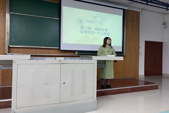 然后,罗田、余欢分别分享了他们在疫情防控期间,分别在各自家乡为疫情防控做出了自己的努力与贡献。在他们的分享中同学们充分感受到在党的坚强领导下,作为青年学子的我们应该勇做时代新人、敢当时代责任。