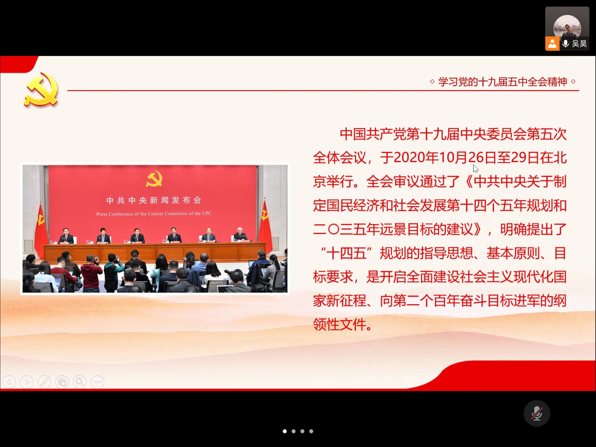 吴昊同学分别从规划《建议》起草、亮点、突出议题,双循环的新发展格局,如何实现2035远景目标五个方面深刻地介绍此次党的十九届五中全会精神,详细阐述了起草遵循的五项原则,核心要义的体现,其重要地位并介绍了部分主要议题。吴昊同学着重强调了三个值得关注的“首次”。让同学们感受到规划《建议》真正体现我们党为中华民族谋复兴、为中国人民谋幸福的初心使命。
