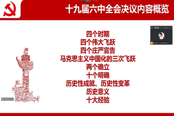 2019级本科团支部书记概括性地介绍了十九届六中全会的主要议程,以及为什么要总结党的百年奋斗的重大成就和历史经验。并进一步对《决议》内容细节的分主题讲解。《决议》将党的历史分为四个时期,在这百年的过程中完成了四个伟大飞跃,实现了中华民族站起来、富起来、强起来的转变;随着这个过程,马克思主义中国化完成了三次飞跃,从诸多历史性成就与变革中总结出了宝贵的经验与党的奋斗意义,应证了坚持马克思主义指导、坚持党的领导、坚持以民为本的道路的正确性。