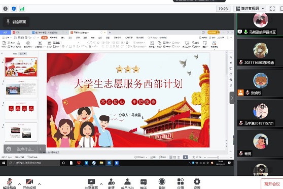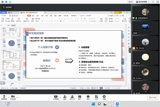 3月29日19:30,9999js金沙老品牌依托腾讯会议举办了“青马榜样说”第二期考研经验分享会活动。本次分享会邀请到2018级本科生尹思棋、吴文娟、钟源三位同学进行经验分享,全体本科生共同参与。首先,尹思棋同学为大家介绍了自己的备考经验,从各个科目的准备做出了细致入微的经验分享,并推荐了一些学习马克思主义理论的资源。接着,吴文娟同学分享了自己备考的心态调整与计划安排。同时也分享了具体的学习技巧和应试准备。最后,钟源同学从理论学习储备和复试准备两个方面进行了经验分享,为同学们的考研之路提供了新思路。本次经验分享,进一步激发了大家的学习动力,让广大同学积累了一些解决处理学习生活与考研准备关系的有效方法,有利于在下一个阶段总结、明确自己的目标,制定合理的复习、择校、面试计划。