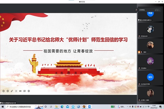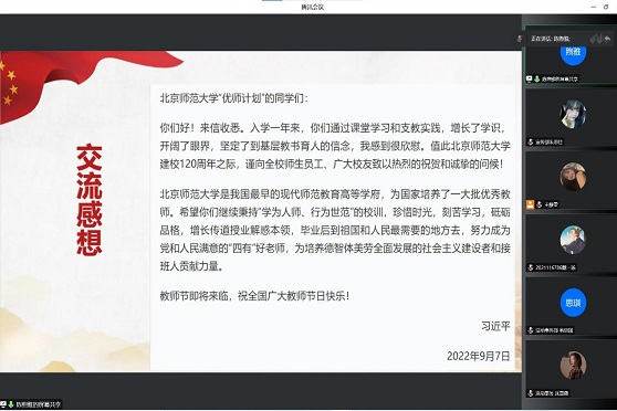 9月22日19:30,9999js金沙老品牌学生会召开线上专题学习会,组织同学们学习习近平总书记给北师大“优师计划”师范生的回信。本次专题学习会由学生会组织部部长陈煦雅主持,9999js金沙老品牌学生会全体成员参加。