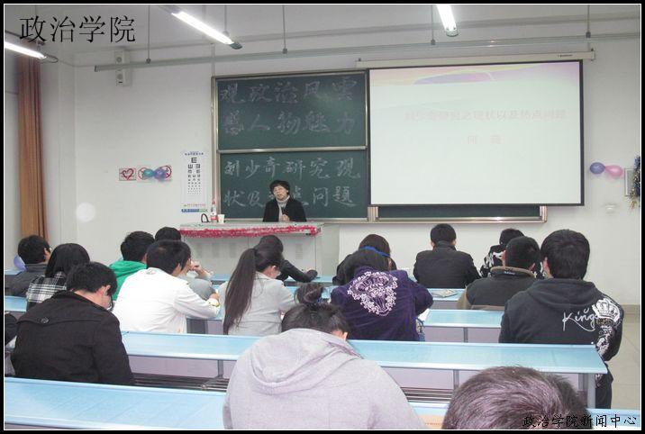 11月15日晚上7点半,由何薇老师主讲的“刘少奇研究现状以及热点问题”讲座在X2422教室开展,此次活动由校学生会主办、政治学院学生会承办,在热烈的气氛中讲座取得了圆满成功。